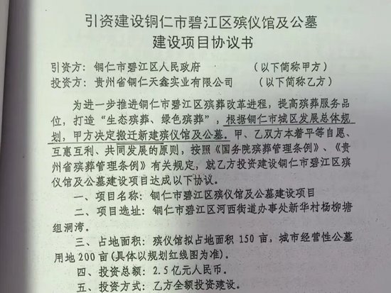 2014年6月,铜仁市碧江区政府与贵州省铜仁天鑫实业有限公司(以下简称“天鑫公司”)正式签订协议书,约定政府方负责土地供应和协助办理相关手续,天鑫公司投资2.5亿元、30个月建设完成。