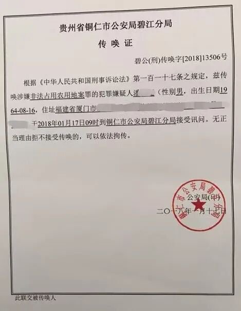 盖有铜仁市公安局碧江分局的《传唤证》描述称,传唤涉嫌“非法占用农用地案”的犯罪嫌疑人潘某超(时任天鑫公司法人代表)。此后,警方又以同样的涉案罪名传唤了天鑫公司投资人刘某年和叶文洁。
