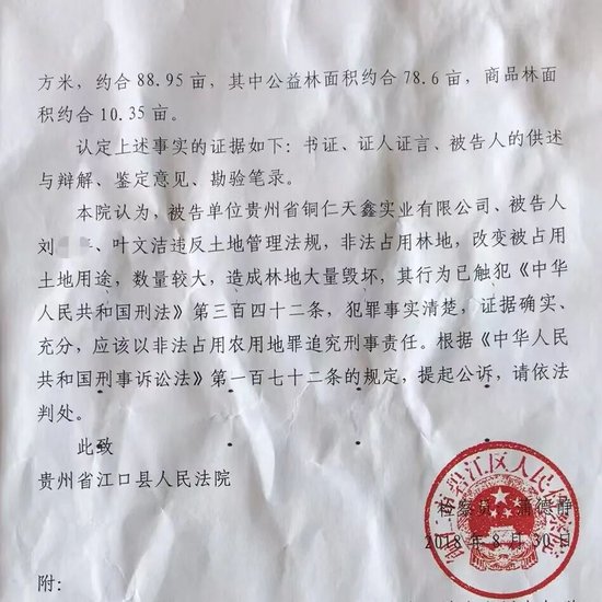 2018年8月,碧江区检察院以非法占用农用地罪对天鑫公司及刘丰年、叶文洁提起公诉。