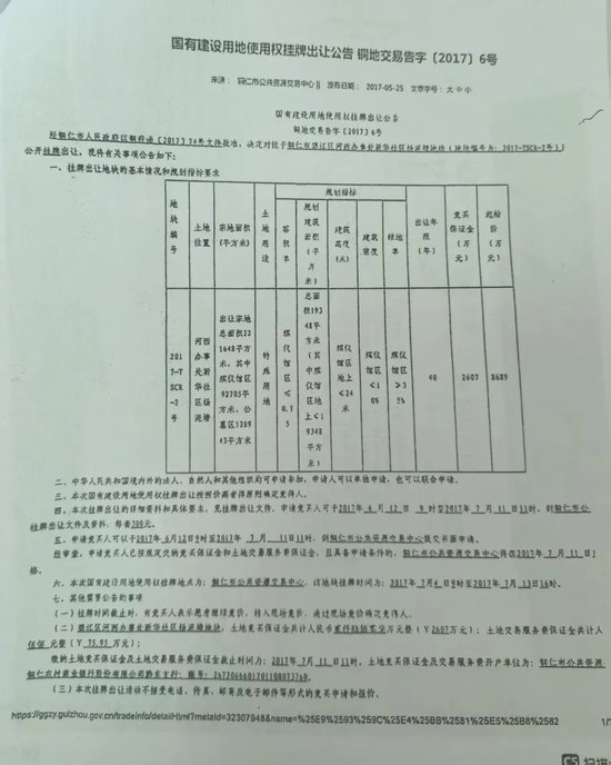 2017年,项目进入收尾阶段,土地挂牌出让的消息终于传来。5月5日,铜仁市公共资源交易中心发布公告,将项目涉及的221648平方米(约332亩)土地,以8689万元的价格挂牌出让,竞买保证金为2607万元。