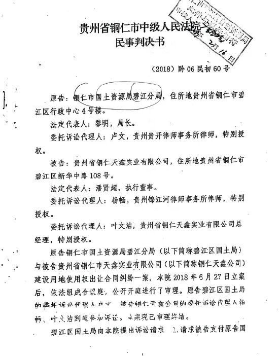 碧江区政府部门启动刑事手段之外,还发起民事诉讼。2018年6月,碧江区自然资源局以天鑫公司 “拖欠土地出让金” 为由,向法院提起诉讼,要求企业支付欠缴的6081.8万元(1738万元+4344万元),并缴纳近1.2亿元滞纳金,两项合计超过1.8亿元。